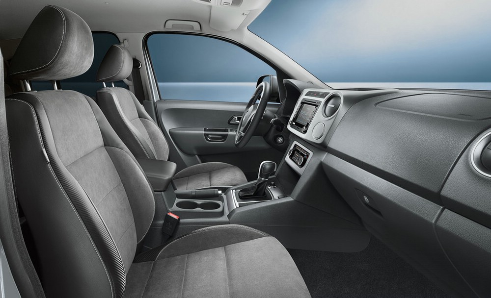 Volkswagen Amarok Black Label – Im Innenraum befindet sich ein höherwertigeres Cockpit, Alcantara-Sitzbezüge, Velours-Fußmatten mit Schriftzügen, das Radio-Navigationssystem RCD 310, Multifunktionslenkrad, beheizbare Vordersitze sowie beheizte Scheibenwaschdüsen. Weiterhin inklusive ist die Durabed-Beschichtung für den Laderaum. Foto: Auto-Medienportal.Net/Volkswagen