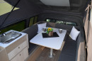 Auf der Fahrerseite ist der Küchenblock untergebracht, er lässt sich durch ein ausklappbares Tablett erweitern. Ein transportabler Spirituskocher dient zur Zubereitung kleiner Mahlzeiten oder einer Tasse Kaffee oder Tee „outdoor“ oder im Fahrzeug. Bei geöffnetem Fenster kann der ausziehbare Waschbecken-Einhebelmischer auch als Außendusche genutzt werden. Selbst ein tragbares WC findet seinen Platz in der Sitzkiste zum Fahrerhaus hin. Durch Absenken der Tischplatte mit ihrem herausnehmbaren Tischfuß verwandelt sich die Sitzgruppe in ein Doppelbett.
