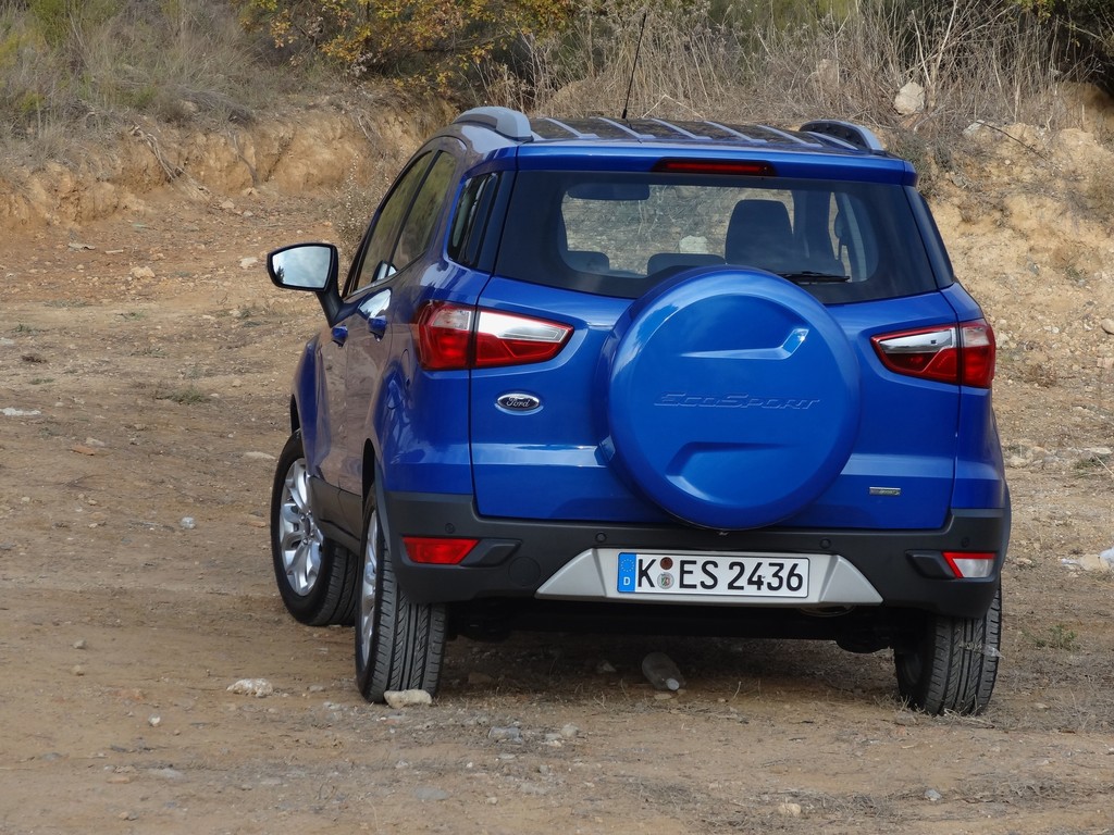 Ford Ecosport: Mit 200 Millimeter Bodenfreiheit, großen Böschungs- und Rampenwinkeln, einer Wattiefe von 550 Millimetern sowie dem auf der Hecktür aufgesetzte Reserverad sieht er auch nach dem jüngsten Facelift aus wie ein Kompakt-SUV der ersten Generation mit großer Nähe zum Geländefahrzeug. Doch tritt er in Deutschland (noch) ohne Allradantrieb an. Frontantrieb sei in dieser Klasse wirtschaftlicher und beim Kunden beliebter, meint Ford, auch wenn die Wettbewerber des Ecosport Allrad-Anteile von 40 Prozent und mehr erreichen. Vielleicht ist das der Grund, weswegen Ford für den deutschen Markt in der zweiten Jahreshälfte 2014 nur 4000 Verkäufe einplant. Foto: Auto-Medienportal.Net