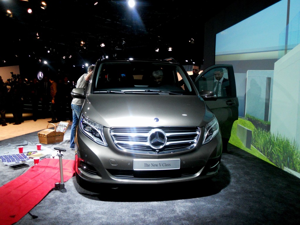 Die Mercedes-Benz V-Klasse gibt sich auch von Außen als ein Mitglied der Mercedes-Familie zu erkennen. Im Zentrum der kraftvollen Front stehen die aufrechte Kühlermaske mit dreidimensionalem Zentralstern und die progressiv gestalteten Scheinwerfer, die erstmals in diesem Segment auf Wunsch alle Lichtfunktionen in LED-Technik anbieten. Foto: Auto-Medienportal.Net