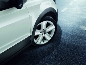 VW CrossPolo Urban White – Die 17-zölligen Leichtmetallfelgen stehen in gutem Kontrast zur Außenhaut des CrossPolo. Foto: VW/Auto-Reporter.NET