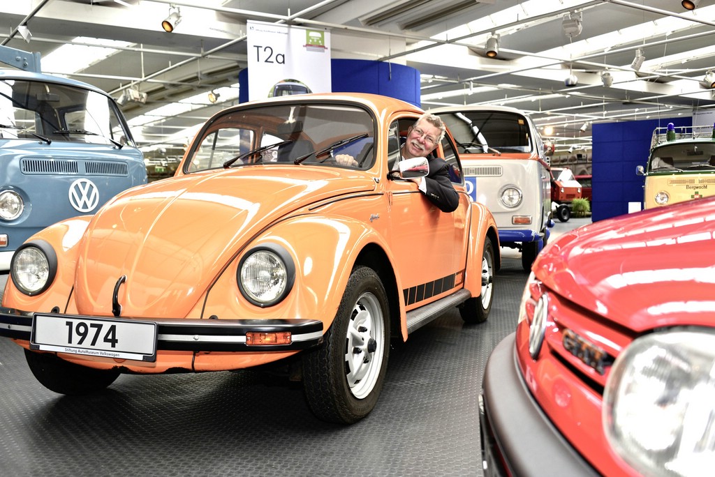 Eberhard Kittler, Vorstand der Stiftung AutoMuseum Volkswagen, im Jeans-Käfer von 1974.